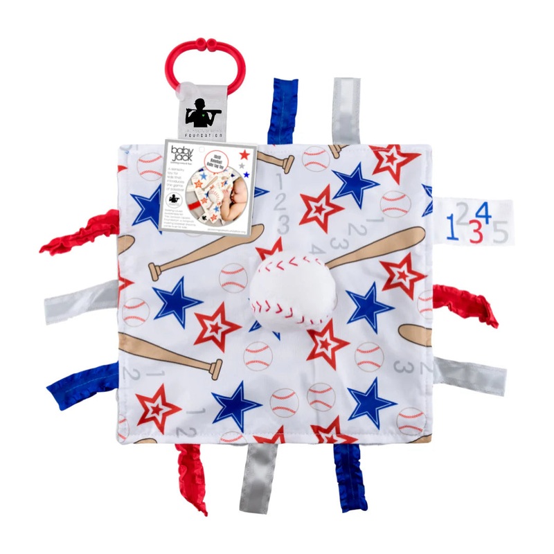 The Baby Jack Baseball Learning Lovey is accented with coordinating ribbons that are sewn shut, so little fingers do not get intertwined in the ribbon loops. The variety of textured ribbons and fabrics encourage tactile play and help children develop cognitively, socially and emotionally through sensory interaction.