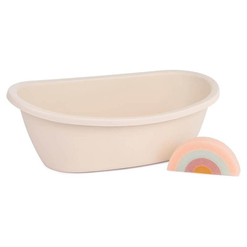 The Bathtub and Rainbow Sponge Set is an eco-friendly play accessory designed for dolls up to 16 inches (approximately 40 cm). Crafted from bioplastic derived from sugarcane, this set promotes sustainable play. It includes a beige bathtub and a rainbow-shaped sponge, encouraging children to engage in nurturing pretend play. This interaction supports social and emotional development, language skills, and environmental awareness.