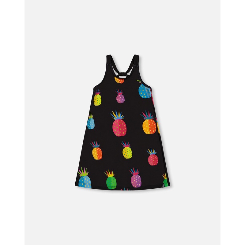 Our Beach Dress Black Printed Pineapples is the perfect coverup for a trip to and from the beach. Made from recycled stretch poly fabric, this slip-on beach dress features wide straps, a scoop neckline, and a loose silhouette. The straps meet in the back t