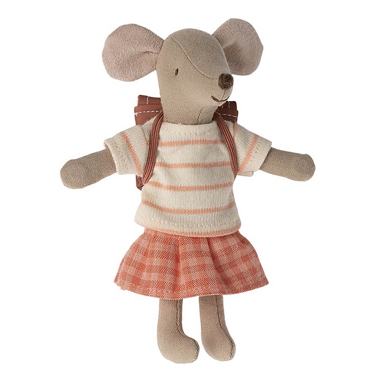 Big Sister Mouse is ready for a day in school, carrying her backpack on the back. She has magnets in her hands so she can hold the handles of the tricycle for a fast trip.Age: 3 years+Material:CottonSize: H5.11 inches*Tricycle sold separately