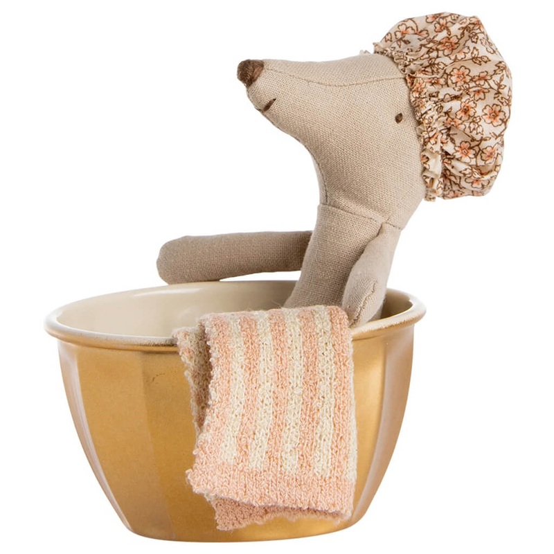 Like everyone else, this mouse loves to spend hours in the warm water of the spa.Age: 3 years+This playset includes a golden bathtub, a mouse, and a towel.Material: CottonSize: H3 x W2 inches