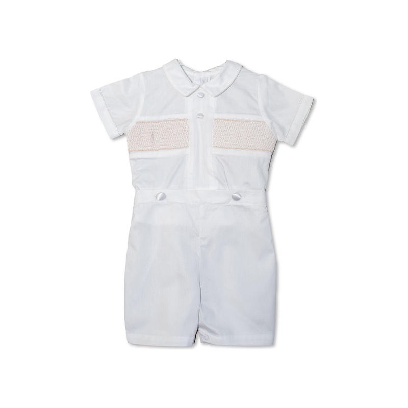 Dress your little one in timeless elegance with our beautifully tailored Boys Bobbie Suit, perfect for his special christening day. This charming two-piece ensemble features a crisp white shirt with delicate pintuck detailing and a Peter Pan collar, paired with soft, pleated shorts that button securely at the waist. Crafted from premium cotton or a gentle cotton-blend fabric, it ensures comfort for your baby while maintaining a polished, traditional look. Finished with decorative buttons and subtle embroidery, this outfit is a graceful choice for religious ceremonies, photo sessions, and treasured family moments.