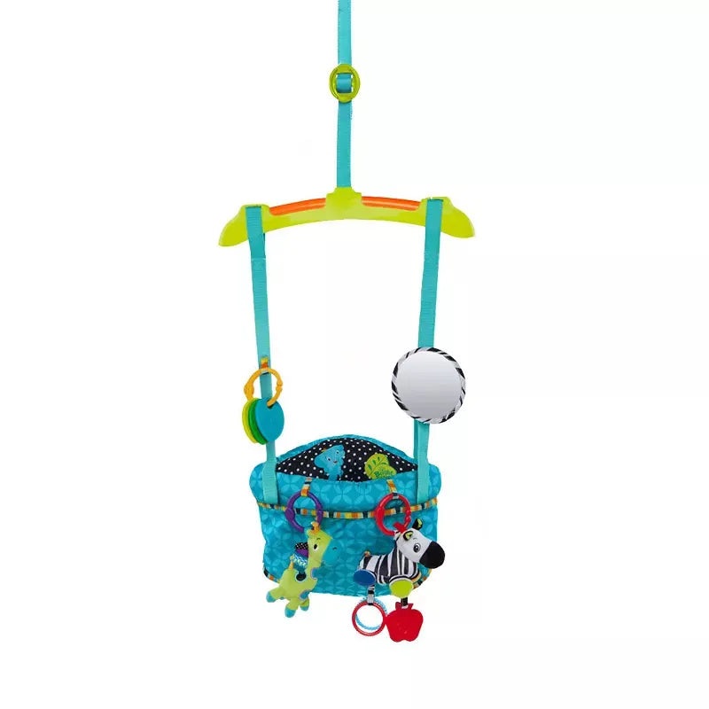 The 4 playtime toys including a plush zebra and giraffe, teethers, and mirror, will entertain while baby jumps.