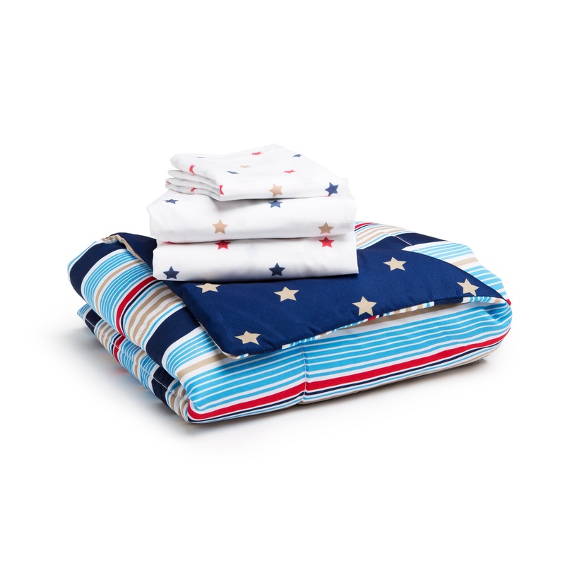 Create the best sleep space for your child with this 4-Piece Toddler Bedding Set from Delta Children. This boys toddler bedding set includes a fitted sheet, flat top sheet, reversible comforter and standard size pillowcase that are printed with fun, bold p