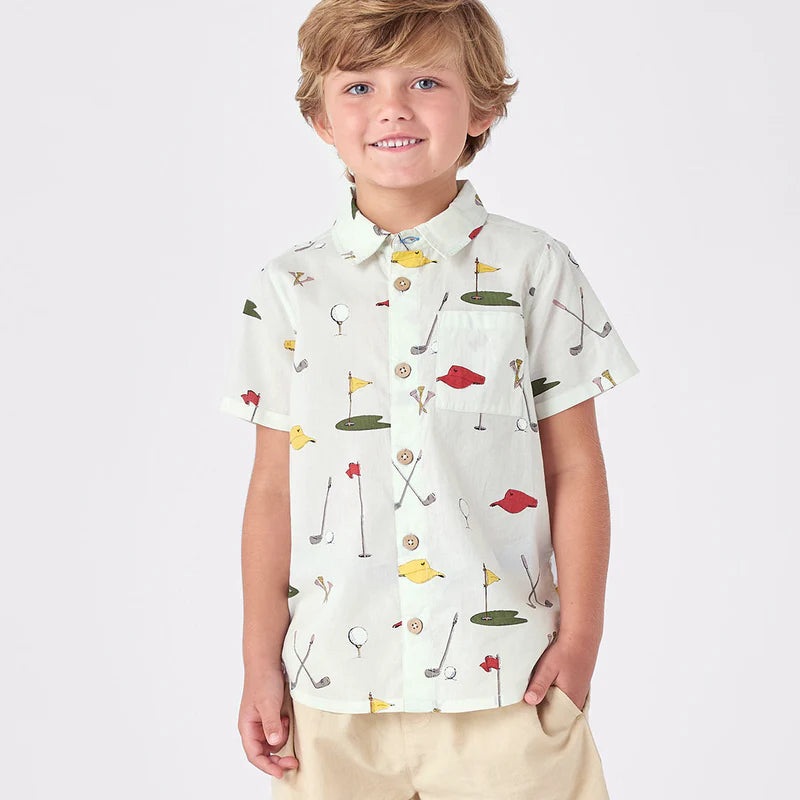 Tee Time! Our Golf Tournament conversation print is a hole in one on our Boys Jack Shirt. Everything you need for a fun day on the links appears right here on this short sleeve, collared collection classic. Faux coconut wood buttons down the front and a pa