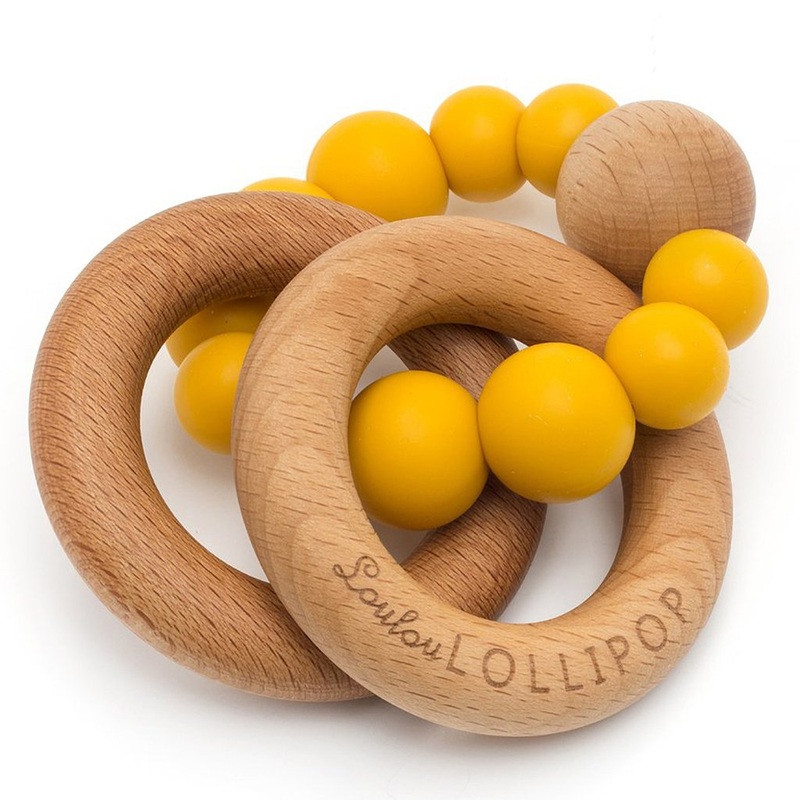 This silicone and wood teething rattle toy for the modern babies is not only visually appealing but also functional. It offers two different textures for the babies toteeth on. The silicone rubber is soft on the gum while the harder wood provides much needed relief.The double beech wooden rings rattles when shaken.