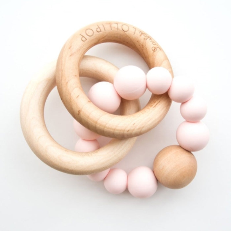 This silicone and wood teething rattle toy for the modern babies is not only visually appealing but also functional. It offers two different textures for the babies toteeth on. The silicone rubber is soft on the gum while the harder wood provides much need