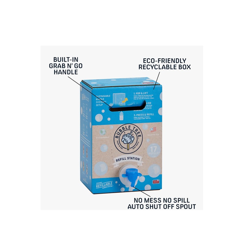 Use all year around. Bubble Tree Original Refillable system is not just safe for the environment but safe for you too. Get rid of one time use plastic bottles. Reuse! Refill! Recycle and Share! This item features 2 Liter of eco-friendly superior bubble solution. This can also be used with our other featured product so Grab N Go and take this to your next celebration, event or just have fun with your family and friends!FEATURES2 liters of Eco-friendly non-toxic superior bubble solutionEnough to refill 17 – 4 fl oz Bubble Tree aluminum bottlesDispensing refill spout included on back to refill bubble bottleOriginal Bubble Tree patent pending design and systemsMade from sustainable packaging that is 100% recyclableCan be used to refill other bubble toysEasy grab handle on back every of box