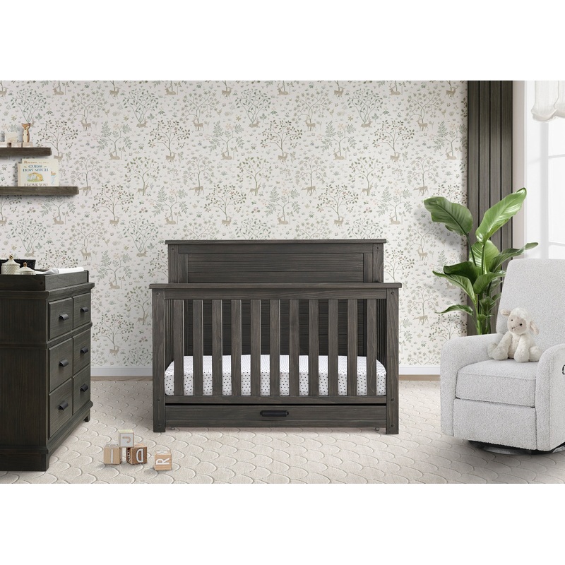 The Caden 6-in-1 Convertible Crib with Trundle Drawer by Simmons Kids is designed with lasting, farmhouse style. The cribs softy textured finish is hand-applied for a rustic look while the included trundle drawer adds additional functionality with space to store extra blankets and other bed linens. Plus, it will accommodate your baby from birth through their teenage years. This cribs grow-with-me design features three adjustable height levels that allow the crib to be lowered as your child begins to stand, and it converts from a crib to a toddler bed, sofa, daybed and full size bed with headboard and footboard or headboard only. Available in Rustic Grey, Rustic Mist and Rustic Acorn. Daybed Rail and Trundle included; Toddler Guardrail #W100726, Full Size Bed Rails #330750 sold separately.