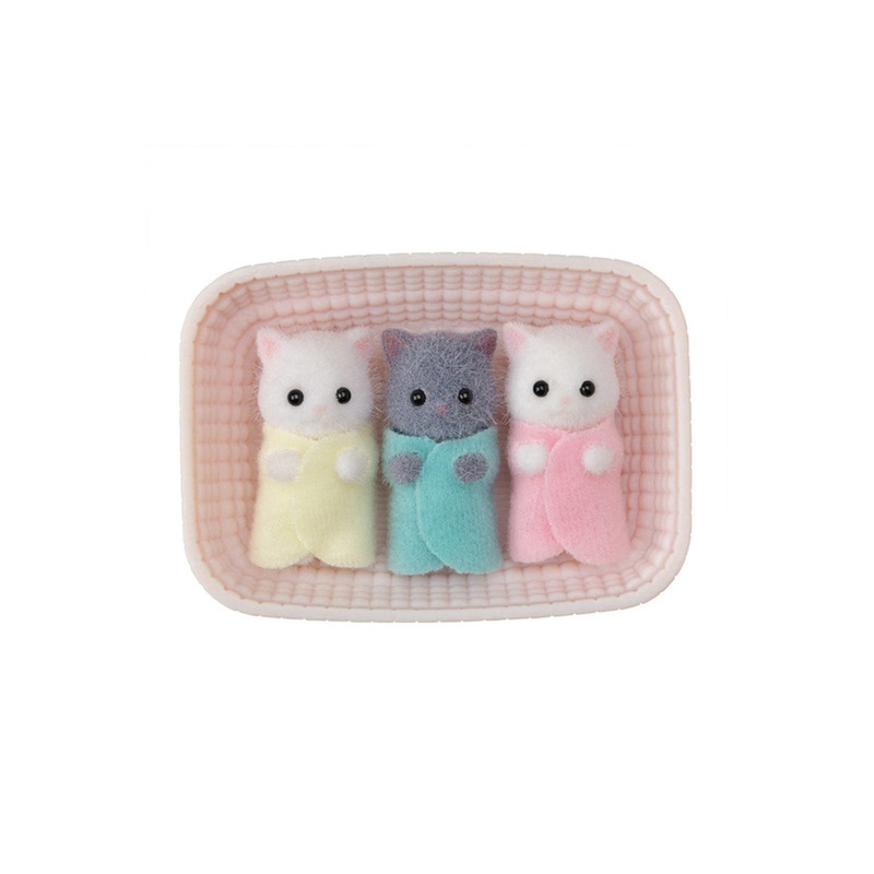 Persian Cat Triplets contains cute and tiny triplet figures. The figures’ heads can move. A set of Persian Cat Triplets and a cradle. Persian Cat Triplets have fluffy fur. You can have all three triplets sleep in the included cradle. The girl in the yellow outfit is mischievous and likes to pull on plants and the ribbons of her sister’s dress. The boy in the mint green outfit loves the smell of mint and the sound of leaves moving in the wind. The girl in the pink outfit grows up the quickest of the three, and was first to roll over while asleep. Combine with Persian Cat Family and Persian Cat Twins for more enjoyable play (sold separately). Enjoy even more varied play with our houses and furniture! (sold separately) Persian Cat Triplet (Yellow Outfit), Persian Cat Triplet (Green Outfit), Persian Cat Triplet (Pink Outfit), Cradle (a total of 4 pieces)Persian cat triplets collectible figuresFour piece set includes three cradled baby figures and pink cradleDressed in removable fabric clothingPlay together with Persian Cat Family, which includes Mother, Father, Sister and Brother figuresSuitable for ages three years and above