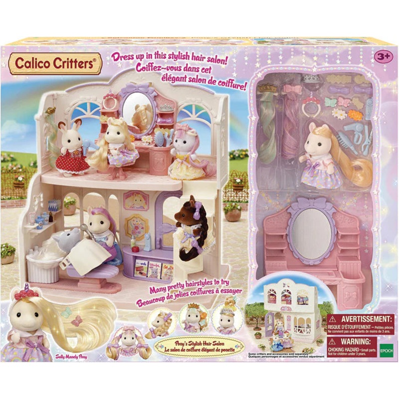 The Pony’s Stylish Hair Salon set features a gorgeous hair salon, and the silky-haired Pony girl, Sally. Includes accessories for hair and makeup play.