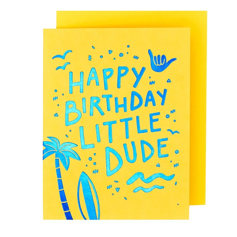 Greeting: "Happy Birthday Little Dude" (Blank Inside) Printing: Blue Foil Card size: 5.5" x 4.25", FoldedPaper: thick colored stock with coordinating A2 envelope