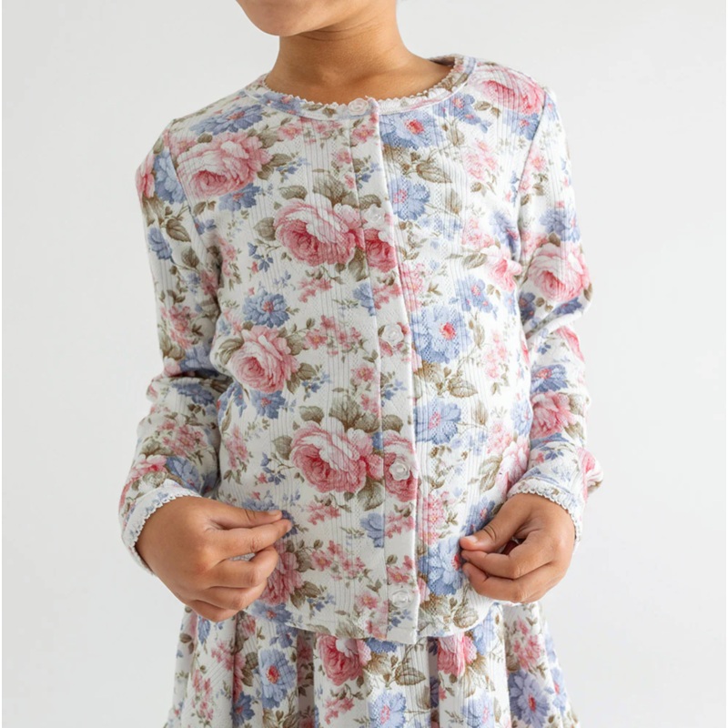 Made for layering, this darling Pointelle Cardigan will keep your little girl cute and cozy all season long! Featuring a beautiful heart eyelet pattern, our pointelle fabric is wonderfully soft and 2x stretchier than our signature viscose from bamboo jersey. This fitted cardigan has picot trim on the neckline, sleeve openings, and fun novelty buttons for extra charm.