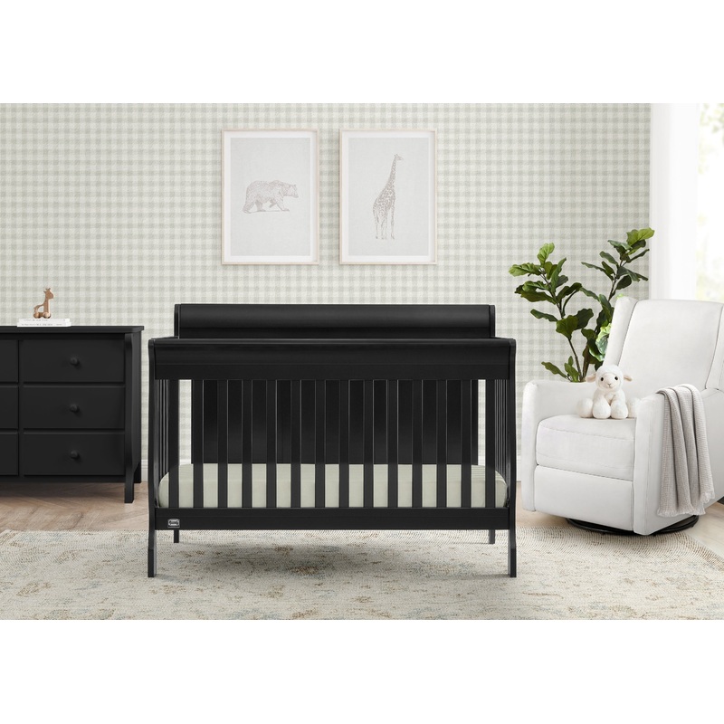 With its sophisticated presence, the Carter 6-in-1 Convertible Crib by Simmons Kids introduces timeless elegance into your nursery. Its sleigh-style silhouette and solid headboard with decorative detailing adds character and depth. Thoughtfully made to grow with your child, you can easily convert it from a crib to toddler bed, daybed, sofa or full size bed with or without a footboard (Daybed/Sofa Rail included, Toddler Guardrail #W100825 and Full Size Wood Bed Rails #0050 or standard bed frame for headboard only, sold separately). Crafted from premium wood and sustainably sourced, non-toxic materials, this crib is a safe and healthy choice for your nursery. Plus, this crib is GREENGUARD Gold Certified, which means its built to contribute to cleaner air for a healthy home. Available in Bianca White, Grey and Black Ebony.