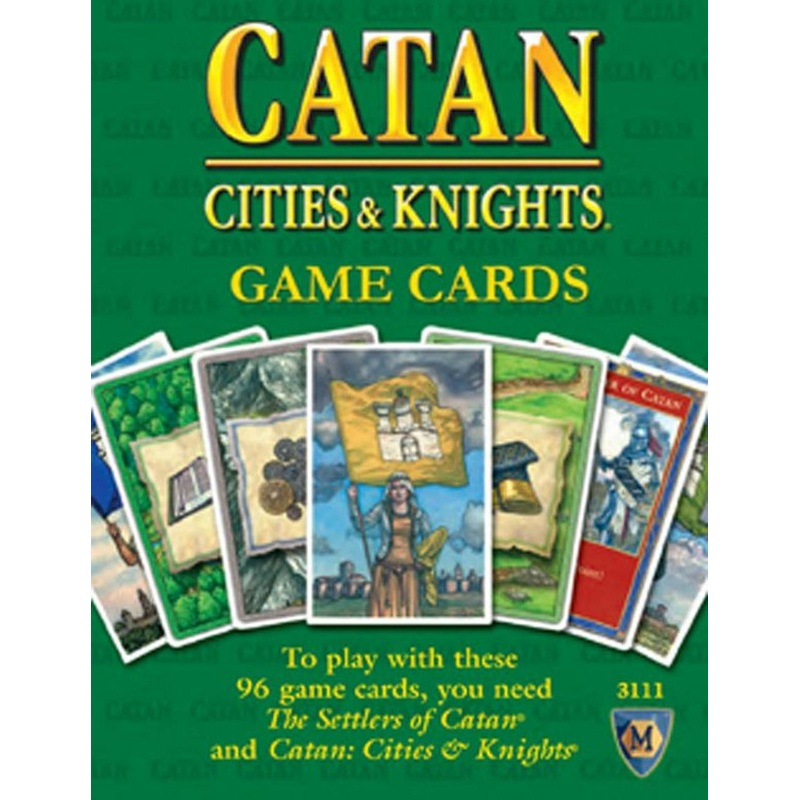 This set of replacement game cards for use with The Settlers of Catan: Cities & Knights expansion. These 96 game expansion cards include: 36 Commodity Cards 54 Progress Cards 6 Victory Point Cards