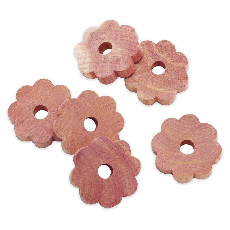Keep your wardrobe fresh with these Cedar Flowers, Pack of 6 6042-4654. They slide on to the tops of your hangers while releasing a naturally moth-repelling scent.
