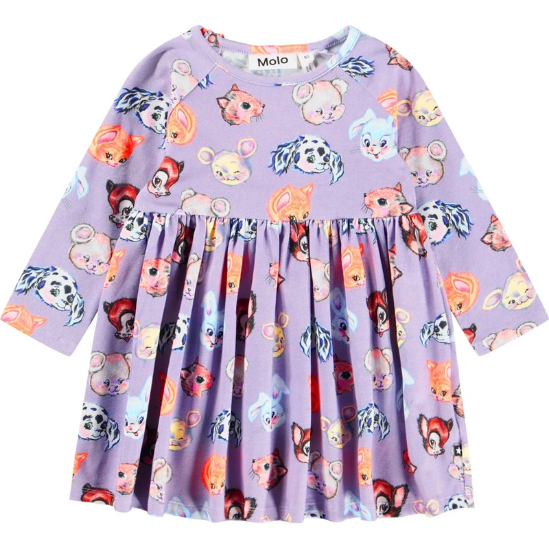 The Charmaine Itty Bitty Dress by Molo is covered in cute characters sure to warm the heart.Long-sleeved dress for the little ones made of organic cotton. The dress is purple and has a print of drawn animals. The top has snug raglan sleeves and a round nec