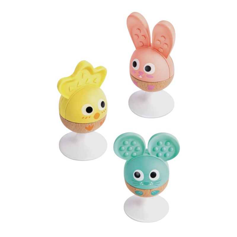 A delightful trio ofmouse, rabbit, and chick rattles. These charming animal companions engage babies with silicone ears that can also massage gums. Plus, the gentle rattle sounds inspire curiosity and sensory exploration.