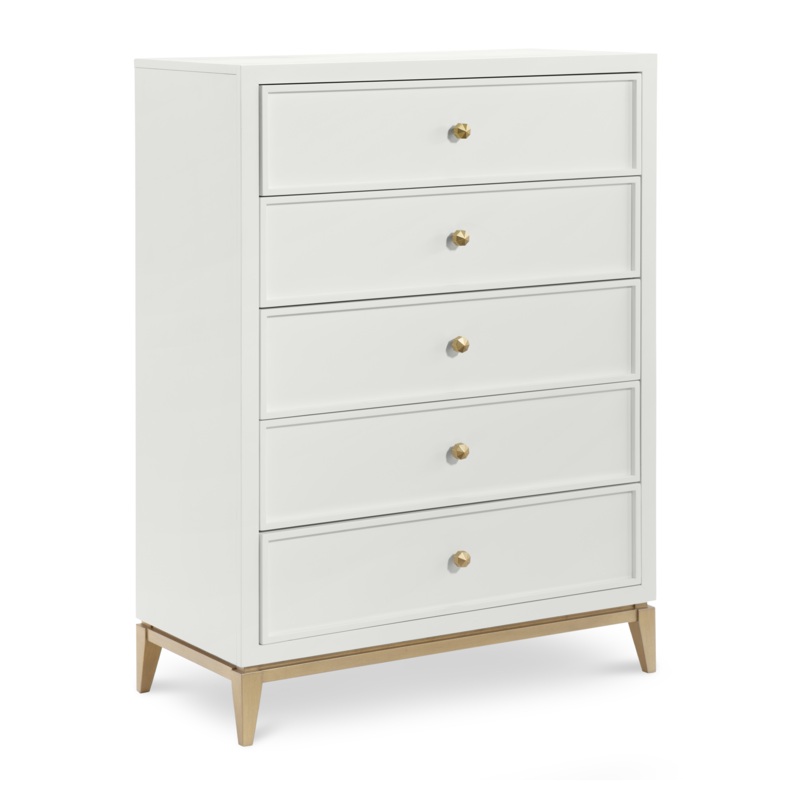 Introducing the Legacy Classic Kids Chelsea by Rachel Ray 5 Drawer Chest, a perfect combination of classic elegance and modern functionality. Designed in partnership with Rachel Ray, this chest features a luxurious gold-accented finish that adds a touch of