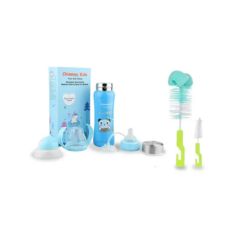 Chinmay Kids Combo of Baby Feeding Multifunctional Stainless Steel Milk Thermosteel Feeder Bottle with Multipurpose Baby Milk Bottle Brush Cleaner Blue Bottle Light Green Brush – 240ml
