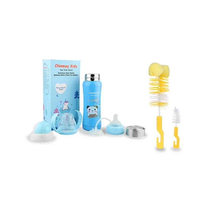 Chinmay Kids Combo of Baby Feeding Multifunctional Stainless Steel Milk Thermosteel Feeder Bottle with Multipurpose Baby Milk Bottle Brush Cleaner Blue Bottle Yellow Brush – 240ml