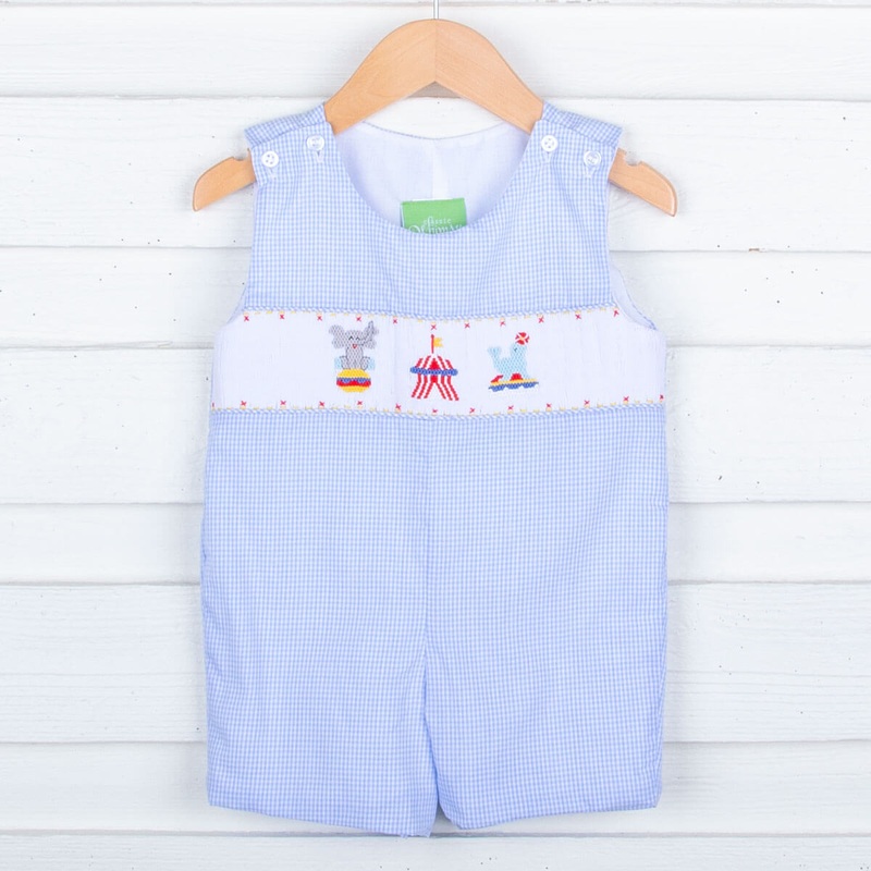 ThisCircus Show Blue Gingham Jon Jon is a must for your little one. Features snaps in stride and hand-smocked circus show.The smocking features a performance of a cute elephant and seal.