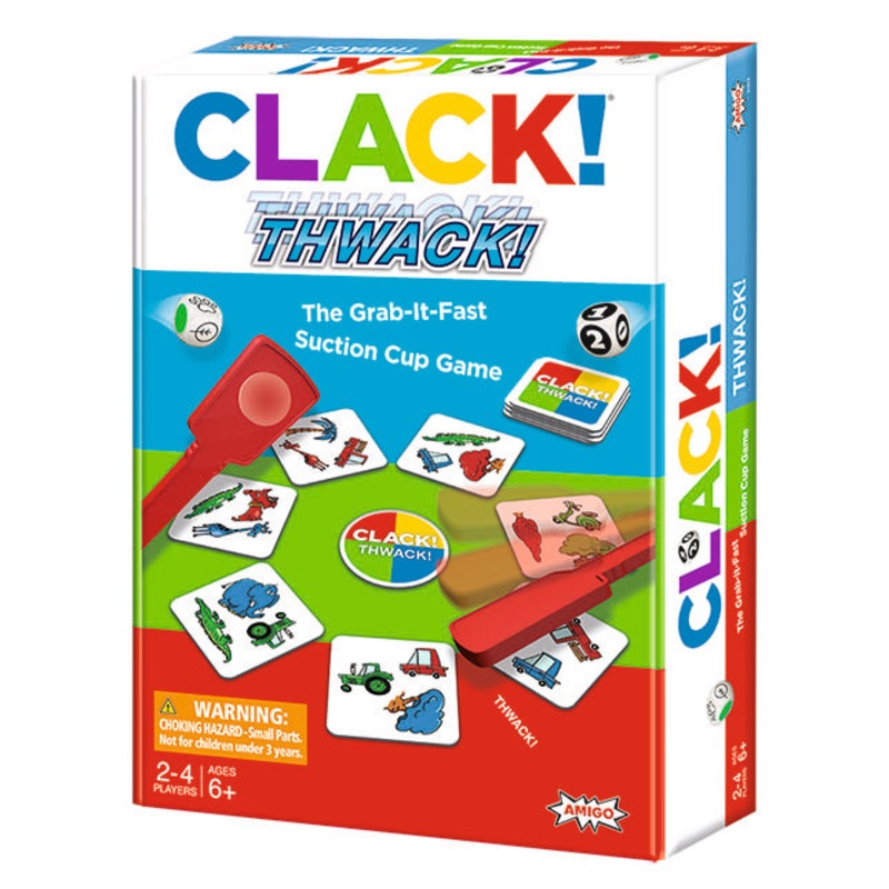 Clack Thwack GameProduct DescriptionThe grab-it-fast suction cup game!Seven token cards, each printed with a different collection of images, are placed around the bonus disc. Everyone readies their thwackers while one player rolls the dice.Two blue items.