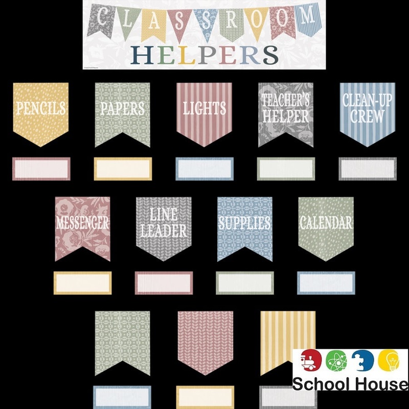 Classroom Cottage Helpers Mini Bulletin Board SetIgnite a sense of responsibility and teamwork with this adorable classroom helpers bulletin board. The set includes titles for Calendar, Clean-Up Crew, Lights, Line Leader, Messenger, Papers, Pencils, Suppli