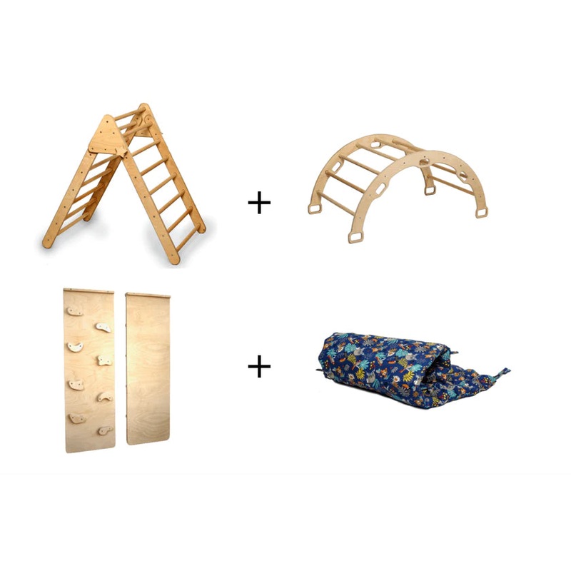 Foldable Best Climbing Triangle set4 Pieces Climbing Set (Climbing Triangle - Arch / Rocker - Blue Pillow - Rockwall Climbing / Sliding Ramp)Description:ThisMontessoriClimbing Set is made of the highest quality natural birch plywood and linden tree. The Fo