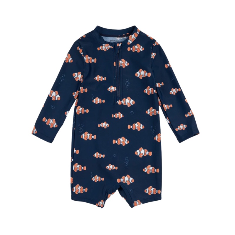 This adorable clownfish-themed romper is perfect for little ones exploring the water for the first time. With long sleeves and built-in sun protection, the romper protects them from sun, salt, chemicals and the cold. A zip at the front loosens the suit when wet, making it easier to remove and snap buttons at the bottom allow discrete and fuss-free diaper changing while at the beach. Made from recycled materials, the romper is comfortable to wear and kinder to the planet. Theres a matching flap hat to complete the look.