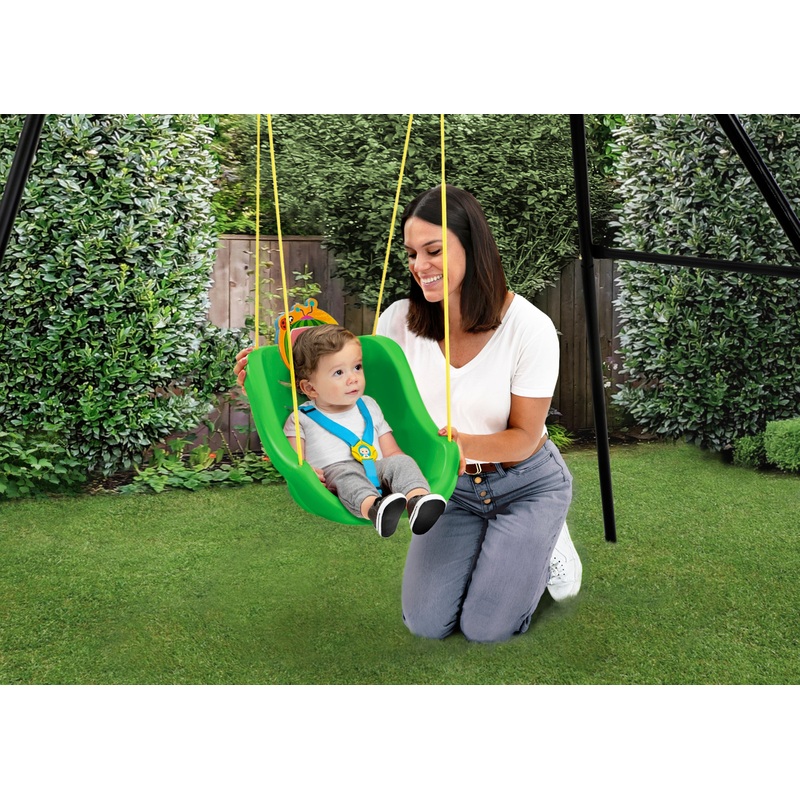 Good times will be in full swing when you get your little one this CoComelon 2-in-1 Outdoor Swing by Delta Children! The swings comfortable bucket seat and high back provides support while the three-point safety harness ensures your child stays securely in placethe harness can be removed as your child grows. A three-dimensional accent at the top of the swing and image of JJ on the buckle adds a ton of character. Made from durable, weather-resistant plastic, it will withstand the elements for many years. Plus, this fun swing comes with everything you need to attach it to your existing play structure, the included rope measures 36-inches from the top of the swing. Ideal for children ages 9-48 months.