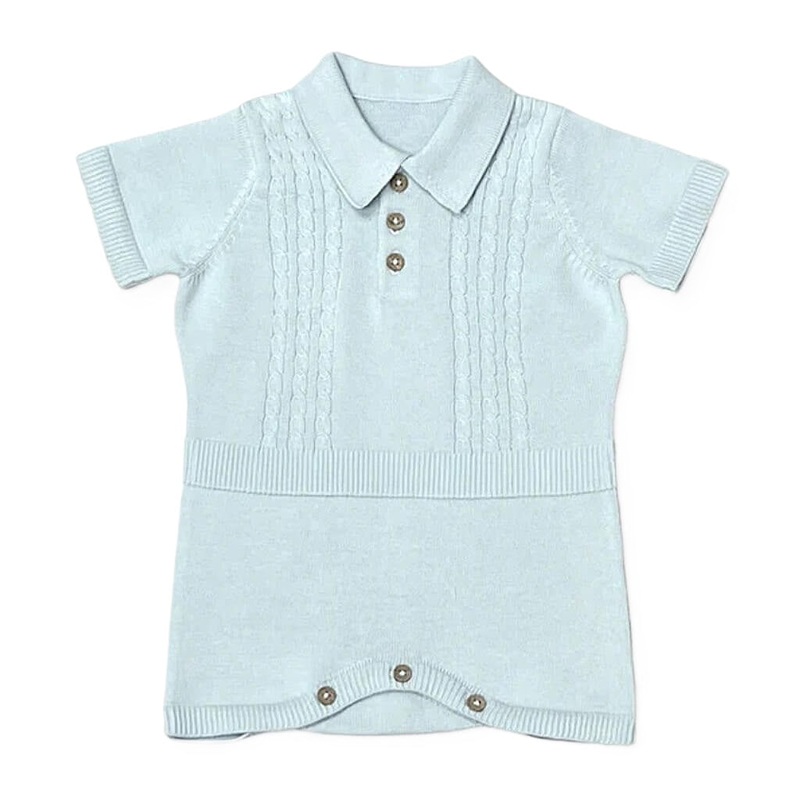 Classic organic sweater knit short-sleeved baby bodysuit with cable knit pattern. 100% organic cotton sweater knit.Featuring a collar and classic cable knit pattern in the front.Button front closure in the front and at the crotch.All-season, lightweight, b
