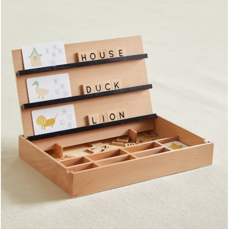 What can be more compelling than spelling? Compelling Spelling is a super fun game that can be played many different ways. Includes 64 wooden letter tiles and 30 beautifully illustrated spelling cards. Identify the item on the card, unscramble the letters on the card, and spell the word with the tiles, or use the tiles to learn spelling without the cards. Kids can even use the cards with out the tiles to learn objects and words. There is no wrong way to play. And it all comes in a nifty box with compartments for all the pieces. Made of plywood, beech and heavy duty printed cardboard, and of course, all non-toxic paints. Be compelled to spell!