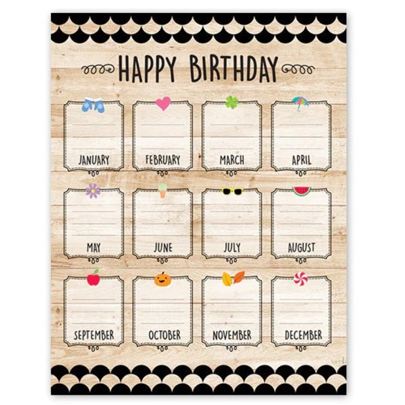 Core Decor Happy Birthday ChartThe Black, White, and Wood Chart will help organize and communicate important information in any classroom. The chart features black and white core patterns on a neutral wood background.Charts measure 17" x 22"