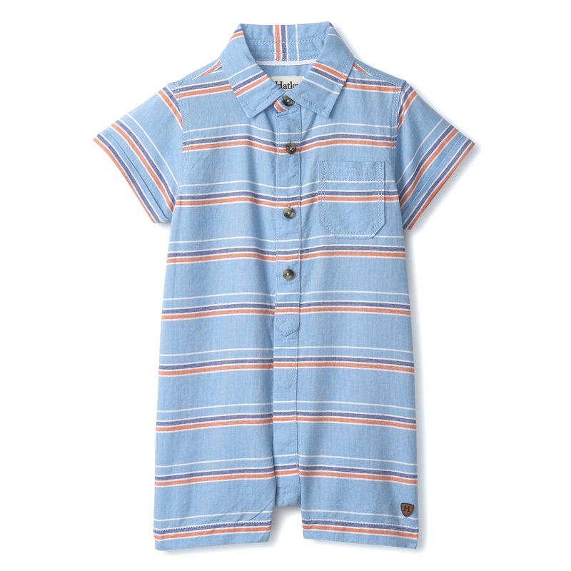 Your active baby will be outfitted for a busy day of play in this zippy-striped romper made from soft cotton chambray.