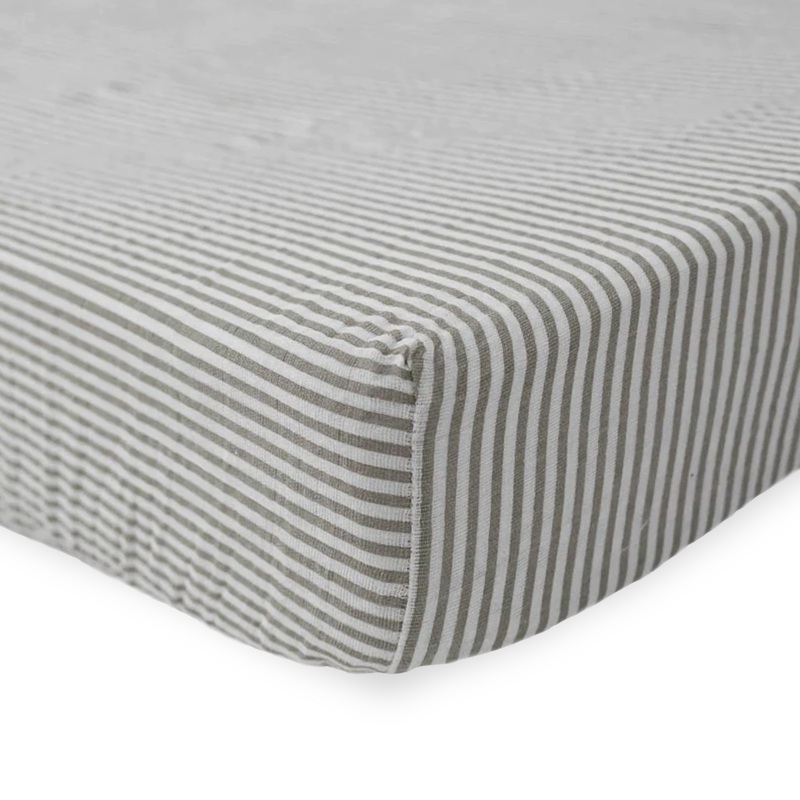 Description This Muslin Crib Sheet inclassic grey stripekeeps baby cozy while maintaining a unique style.100% cotton muslin fitted crib sheetStandard size: 52" x 28" x 6"lightweight and breathablesofter with each wash Dimensions Dimensions: 52"W x 28"H Shi