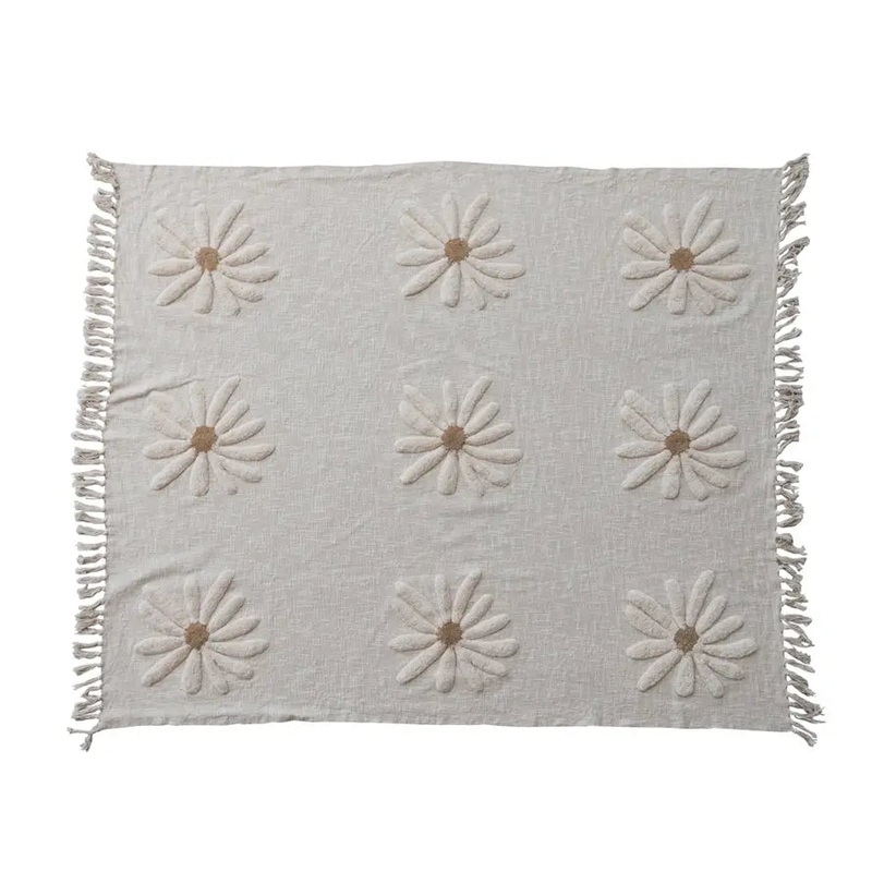 Bring soft texture and charm to your space with this cotton slub throw featuring tufted flowers and fringe. In natural and tan tones, it adds a warm, earthy feel to any room. Perfect for layering on a bed, cozying up on the couch, or draping over a chair f