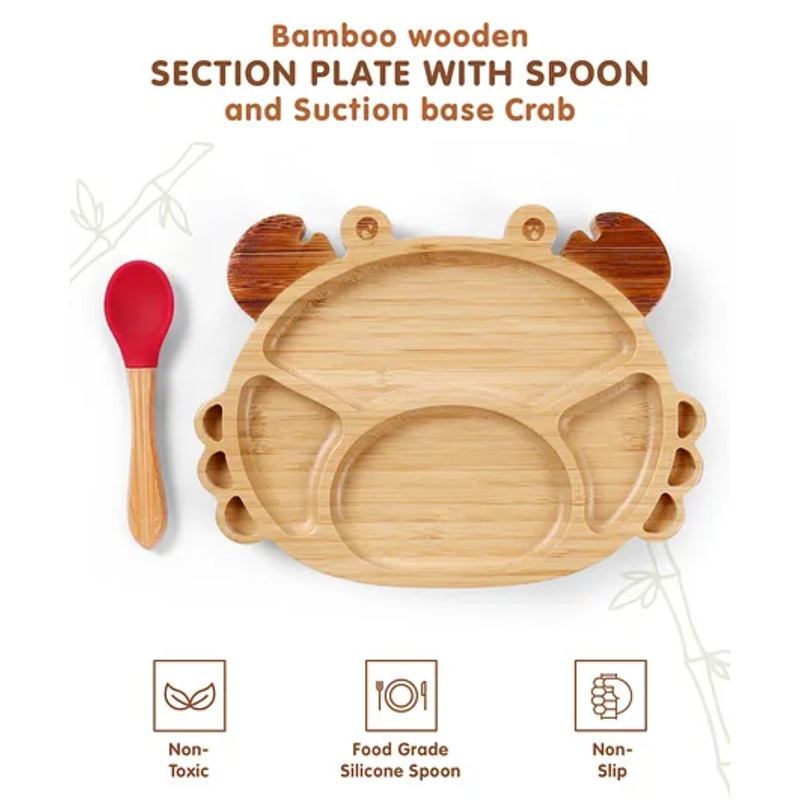 Crab Shaped Bamboo Wooden 2 Compartment Section Plate with Spoon Suction Base – Beige & Red