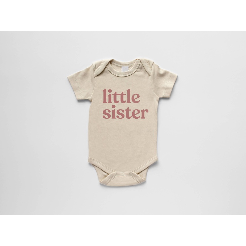 "Little Sister". Dress Little Sis style! This super-soft, 100% organic cotton outfit features modern typography in crisp mauve ink on a luxe cream colored bodysuit - designed with love and screen printed in-house. Short and long sleeve options.Features: 10