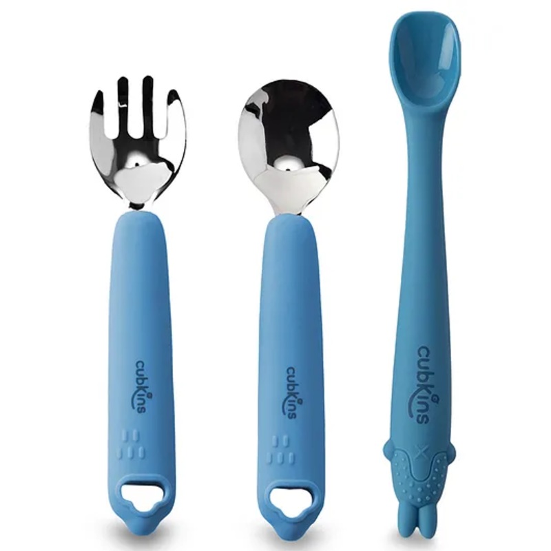 BABY-FRIENDLY DESIGN Curved edges on the Cubkins SS spoonand fork help prevent accidental harm to your baby's delicate gums and mouth,while the soft silicone handles provide a comfortable grip, promoting a saferfeeding experience.TRAINING SPOON The Cubkins