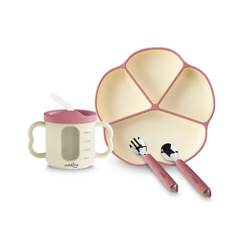 CUBKINS Set of 4 pcs – Plate, Dual Tone Sippy Cup, SS Spoon, SS Fork | Designed for Children | BPA Free, Food Grade, FDA Approved | Easy to Clean (Raspberry)