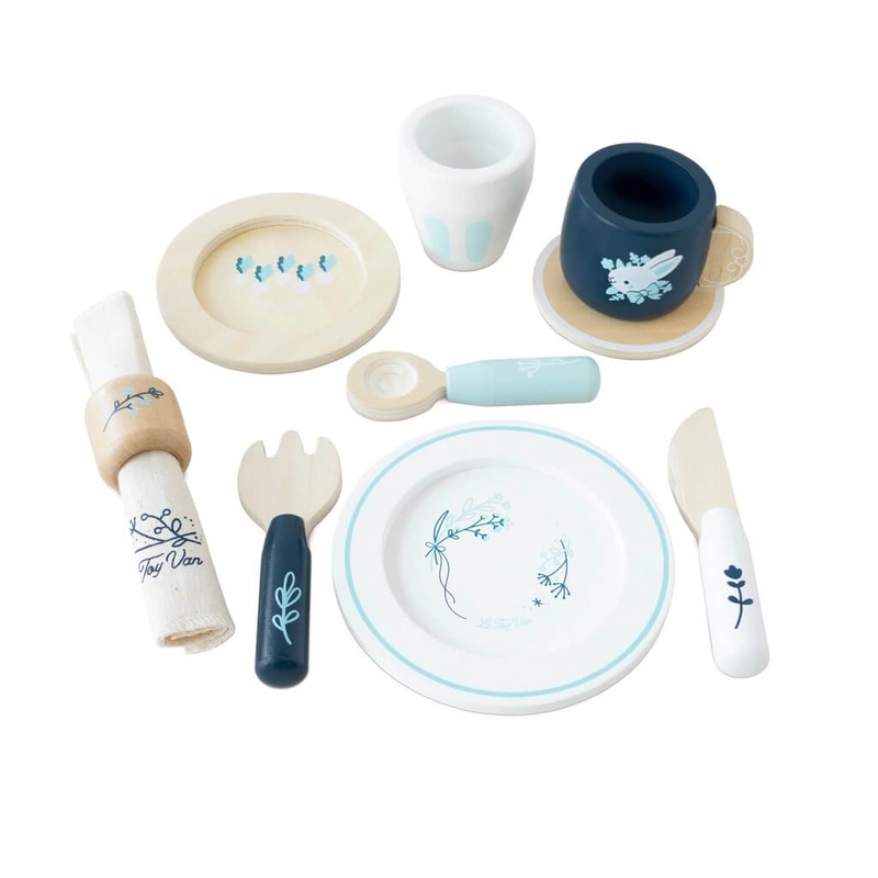 Paintedin blue and white tones and decorated with pretty botanical illustrations, this cute roleplay toyfeatures a full place setting includingmug, coaster, cup, 2 plates, knife, fork, and a spoon., plus a fabric napkin with a wooden holder.