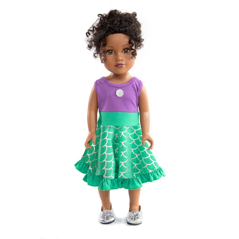 This Mermaid twirl doll dress will turn your childs doll into a beautiful princess ready to twirl the day away.Designed to match our child dress for hours of imaginative playMade from clothing quality stretchy fabrics (machine washable!)Fastens with hook a