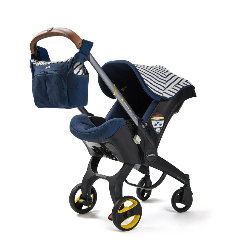 Doona vacation features navy seat cover, matching shoulder pads and a vegan leather handle cover.