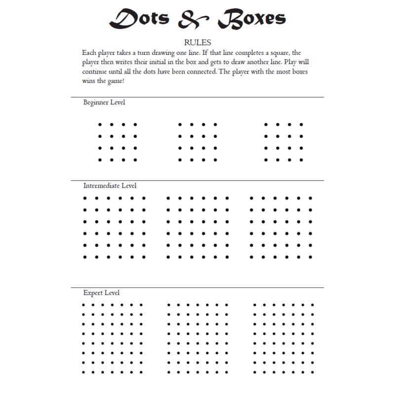Dots and Boxes is a fun two-player game that originates in the 19th century. Since its creation, it has captivated everyone from children playing in the car to bored mathematicians! It has gone under other names such as boxes, pigs in a pen and game of dots. It is a deceiving game that appears simple on paper, but quickly shows how complicated and unique it is in reality. It is a game of strategy, sacrifice and foresight! Each sheet contains three different levels of difficulty: Beginner, Intermediate and Expert. As you add lines of rows, you’ll find that the game’s reach is even further than the previous game! Don’t be fooled, even the beginner level takes a great deal of strategic thinking because you need to expend your moves wisely! Each pad contains 50 sheets so that you can play plenty of games! Each level contains three games, so that you can play best of out of three or simply play all three games! The game works best when you use other colored pens, so stop by ourgel pen selectionfor some great choices! If you are not of the faint of heart and are looking for an Extreme Dots & Boxes game, we have you covered! How to Play: Each player takes a turn drawing one line. If that line competes a square, then the player will write their initial in the box and she/he will get to draw another line. Play will continue until all the dots have been connected.The player with the most boxes wins the game! If you want to see a game played out, check out the video tab and watch the video!
