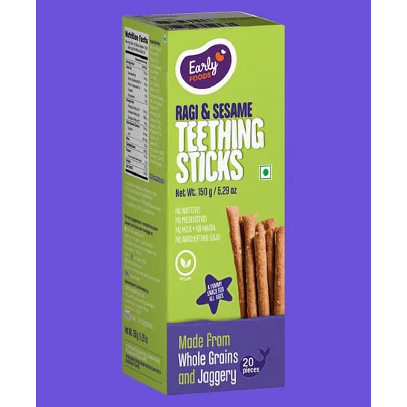 Made from ancient Indian Super FoodsWe make really small batches of food each day. So you can always feed super fresh meals.Grandma inspired recipes, simple, healthy with minimal processingNo Sugar or saltNo Preservatives, colours or artificial flavours. All NaturalSpecificationsBrand – Early FoodType – Ragi & Sesame Jaggery Teething SticksAge – 12 to 24 MonthsQuantity – 150 gmDimension – L 17 x B 8 x H 8 cmNo.of Pieces of sticks – 25Product DescriptionThese whole wheat & Ragi breadsticks are an amazing finger food for your little ones who are just learning how to eat independently. These sticks also soothe the little gums and teeth that are just coming out. Super travel-friendly too. Just give them a stick in hand and watch them enjoy eating on their own.IngredientsWhole Wheat Flour 40%,Ragi\Finger Millet 15%, Cold-pressed Groundnut Oil 14%, Dry Fruits 14% (Sesame Seeds 6%, Sunflower Seeds 4%, Almonds 2%, Cashews 2%), Jaggery 12%, Amaranth 2%, Ajwain 1%, Jeera 1%, Rock Salt 0.99%, Turmeric 0.01% and nothing else.Items Included in the Package1 Ragi & Sesame Jaggery Teething Sticks (25 Pieces)