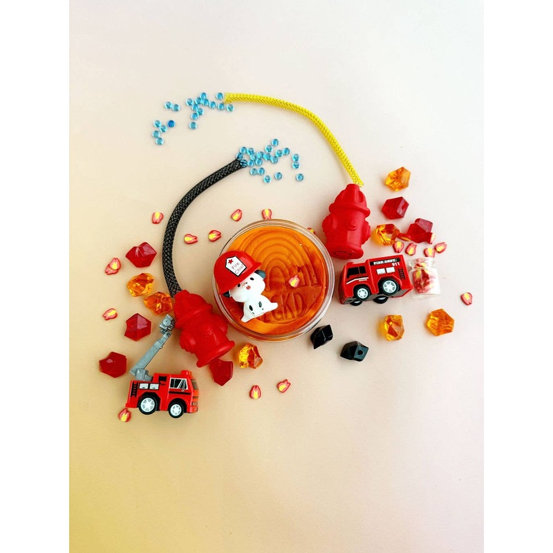 Firetruck coming through to save the day! Drive the firetruck through the Fire Marbled (Cherry Mango) KidDough and enlist the help of your Dalmatian friend to build and fight fires.Includes: 8 oz Red and Orange Marbled (Cherry Mango) KidDough, 2 Jars of Mi