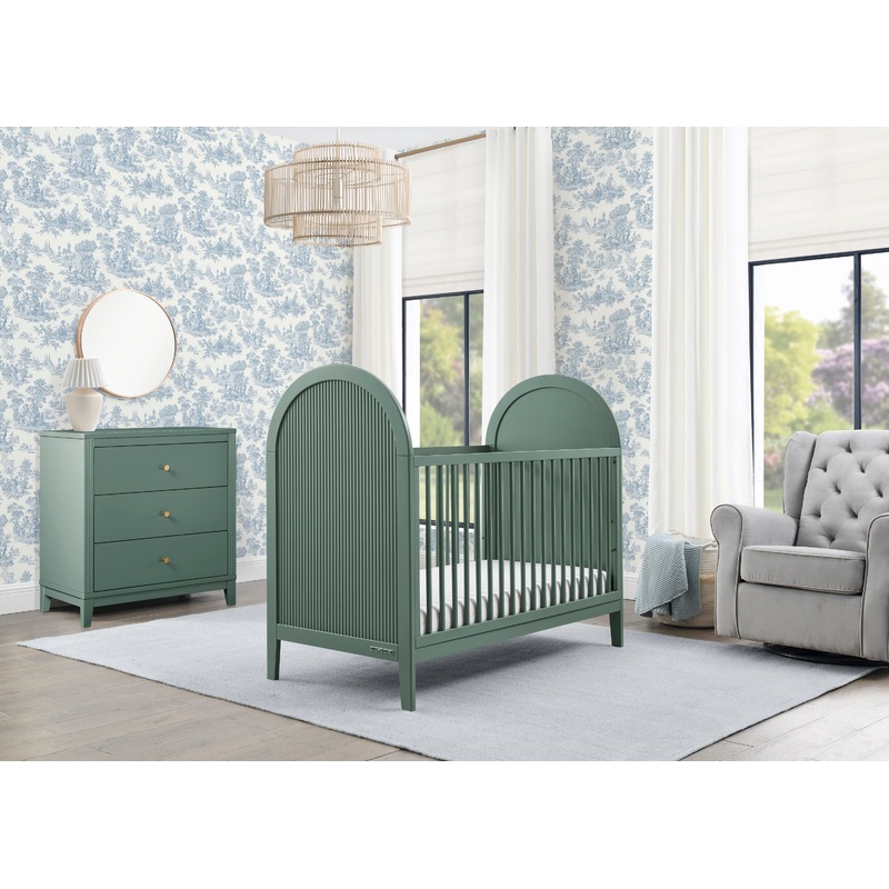 The Eloise 4-in-1 Convertible Crib by Delta Children is an elegant mix of classic style and contemporary touches. It makes a dramatic statement with its round spindles and modern detailing on the arched end panels. Designed to effortlessly grow with your baby, the Eloise features three mattress heights, and converts into a toddler bed, daybed and sofa (Daybed/Sofa Rail included; Toddler Guardrail #W100725 sold separately). Plus, this crib is GREENGUARD Gold Certified, which means its built to contribute to cleaner air for a healthy home. Available in Bianca White, Moonstruck Grey, Midnight Grey and Grassy Glen. Crib mattress sold separately. To complete the look, pair this crib with the coordinating Eloise 3 Drawer Dresser with Changing Top.