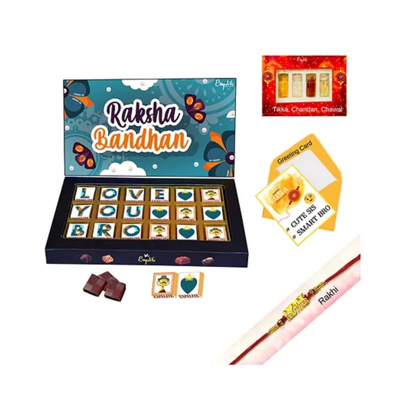 Premium 18 piece assorted flavor chocolates with raksha bandhan themeChocolate Flavors Roasted dry fruit Filling, Cranberry filling, pan filling, butterscotch filling, mix fruits filling, Choco chip filling.Real products are same as they look in pictures.H
