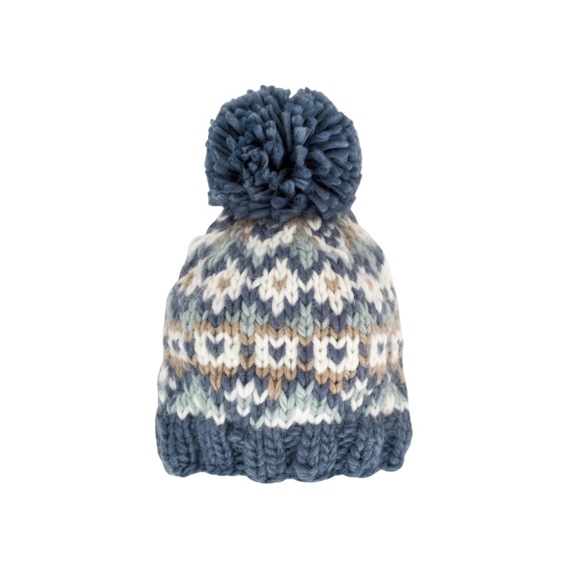 Knit in soft, chunky yarn, this hat has an intricate pattern in Slate Surf, Pebble and Winter White yarn and topped with a pom pom.Each hat is partially knit from recycled, sustainable Polyester yarn made from plastic bottles. Huggalugs is on a mission to